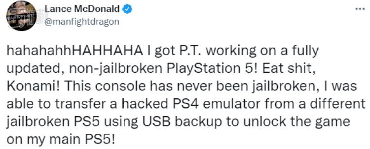 10月4日,McDonald利用漏洞进入PS5的调试菜单,通过USB传输安装《P.T.》,从而绕过PS商店的黑名单限制,结果却没能启动游戏。他认为,PS5的系统文件中还留有第二份名单,因为这份名单的存在,即便登陆拥有《P.T.》的PS帐户并成功安装游戏,依然会碰到“这部PS4游戏无法在PS5上运行”的对话框。