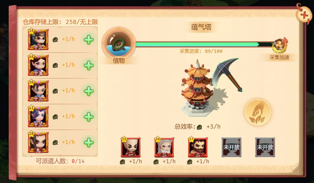 打造装备所需的四项基础资源除了在门派中的建筑可产出,在武林中还有一些可以采集的资源点,只需要将闲置的侠客安排上去,便能在达到储存上限之前不断积累资源,并且还会提供额外的资源储存上限,有效提高了掌门每天可以打造的装备数量上限。