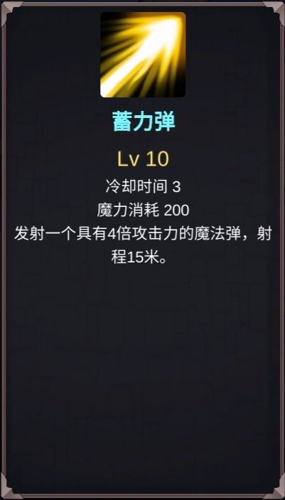 满级效果:发射一个具有4倍攻击力的魔法弹,射程是15米,冷却3秒(距离超长,可达三分之二的屏幕)