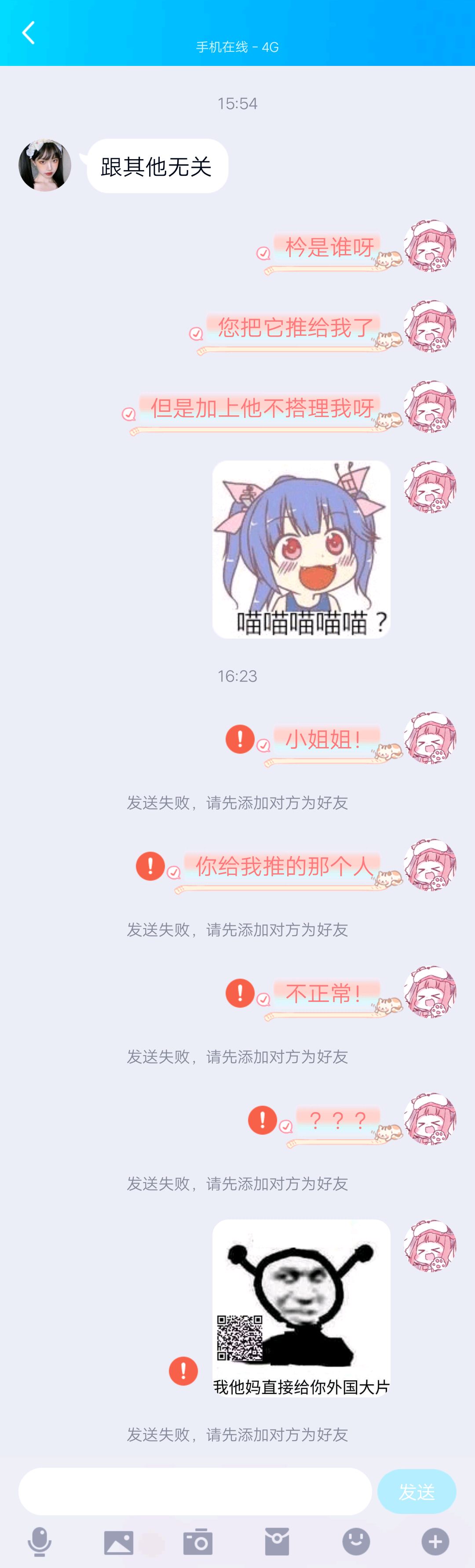 官群里突然收到了好友申请,一看,诶,挺漂亮的小姐姐(一看就是见过的网图),没想到还挺好玩,聊天记录如下