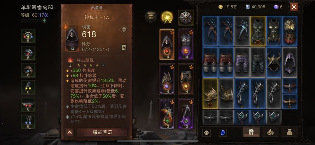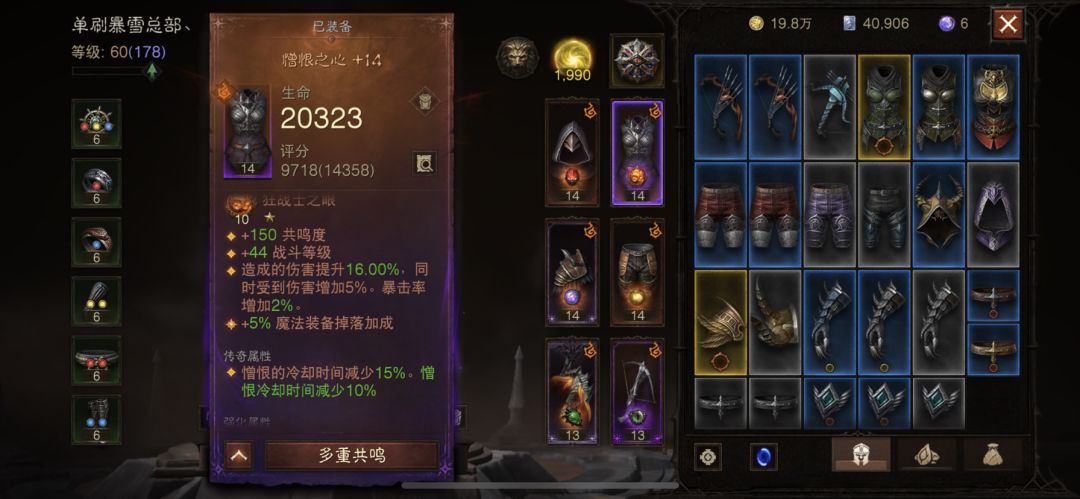 当然我这套宝石搭配比同共鸣5星宝石乱凑得肯定是投入大点,但是没办法高投资高回报,我感觉3200共鸣左右猎魔都没我这个玩起来舒服,毕竟觉醒两件,憎恨的丝滑和附加伤害大概稳定在40左右,狂战士16 猎神24吃不满算16 加副手10伤害。 而且我也没怎么肝,绿色只出了套装属性,并不是3+3 现在野外平A在1.4~1.9万的样子,暴击4.3万,嘎嘎的爽。