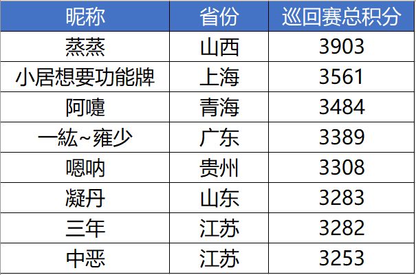 为什么要提到省份问题呢?其实只要看看截至周四晚上的巡回赛周预赛榜单就能理解,全国各地的玩家们都有好好努力,在我们的榜单上冲分呢!