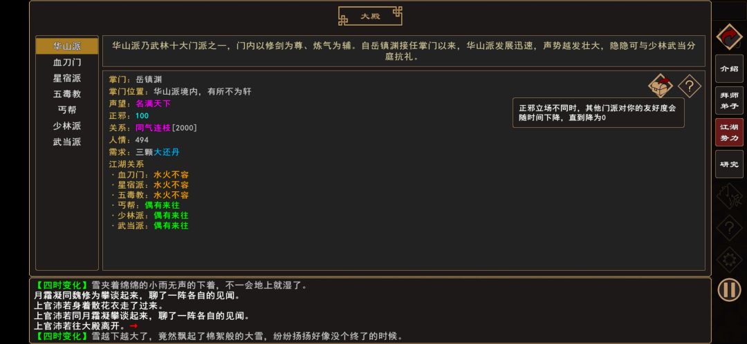 可以看到其它门派有什么需求,以及自己和他们之间的好感及人情,右上角那个问号标明了,如果自己门派正邪和其他门派不同,那么和对应那个门派就会每天降低好感,但是自己门派正邪为0的时候就两边都不会降低,所以建议开局就想办法维持为0,因为后面刷好感还挺麻烦的