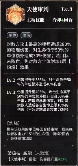 群体技能,不错的伤害,且对附带灼烧和灵火的目标无视25%防御力和提升15%暴击伤害,完美适合火系,但容易被神女的罩子克制。火系卡没有灼烧效果,可惜。