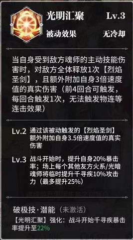 战斗开始增加20%暴击率,一个反击技能,自生收到攻则会释放一次一技能(前四回合生效),且附加3.5被速度的真实伤害,搭配千仞雪的反击,基本上可以在第一第二轮对敌方英雄造成减员。且没一个光暗或者火系卡增加10%攻击力,但为什么上限是25%。由于神女的出现千寻疾二三回合基本上就是刮痧。不过打没有神女的队伍效果还是不错的。