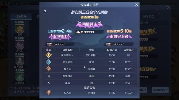 每个占领公会前10名成员均可获得对应的领地称号,这个称号的限时的,榜单会在每天23点刷新排行,也会重新根据榜单排行重新分配对应的称号,请保持战力提升哦!