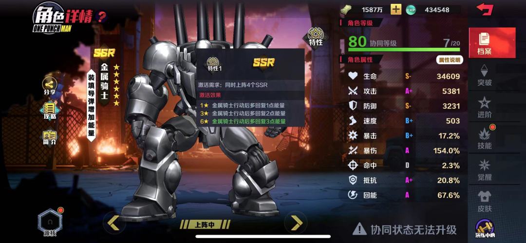 首先是特性,什么是特性,就是在进阶英雄的时候会有额外属性,金属骑士在进阶1星.3星.6星,分别行动结束之后多回复1.2.3能量。金属骑士1星情况下,行动结束后会回复2点(本身角色回合结束之后也会回复一点),前提是上4个SSR,其次是机器人,机器人这个技能不管升没升级,他都是固定回复2点能量,且机器人回合结束也会回复1点,“回收机器人在升到4级之后会让技能消耗能量减1”。