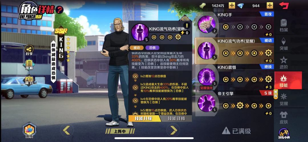 对于king的玩法有两种,一种是堆命中+攻击的控制流,一种是堆暴击+爆伤+攻击的爆发流(吃S技),在平常打本的过程中输出流king的表现还是很不错的,king是非常克制甜心的角色,首先king的技能自带减治疗效果,其次超过50恐惧值有概率(受命中影响)让对面罚站,如果想针对甜心假面的话可以把king养起来,但是想玩king的话,我个人建议要培养到5星,这样的话被动以及绝技都可以点满让恐惧值达到最大化,如果英雄试炼20层被甜心折磨心态的小伙伴们不如试试输出king会有意想不到的效果哦,当然如果打竞技场的话还是推荐大家玩控制流king。