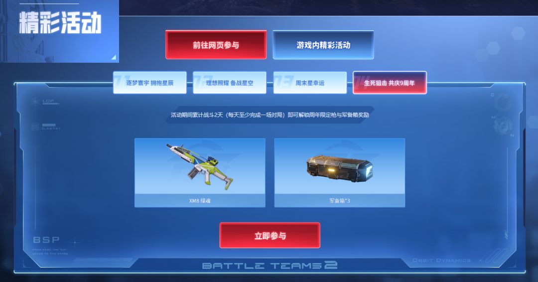 参与游戏端活动,完成登录任务、作战任务等领取观测礼包、军备箱、「M590A1-木星」和金币礼包;特定时间解锁指定区域并完成区域任务,可获得金币、军备箱、构造核心、「M249-木星」奖励。航天版本即将揭开神秘面纱,即刻前往官网(https://www.ssjj.cn/fab?from=taptap)下载游戏,共同征战浩瀚宇宙!
