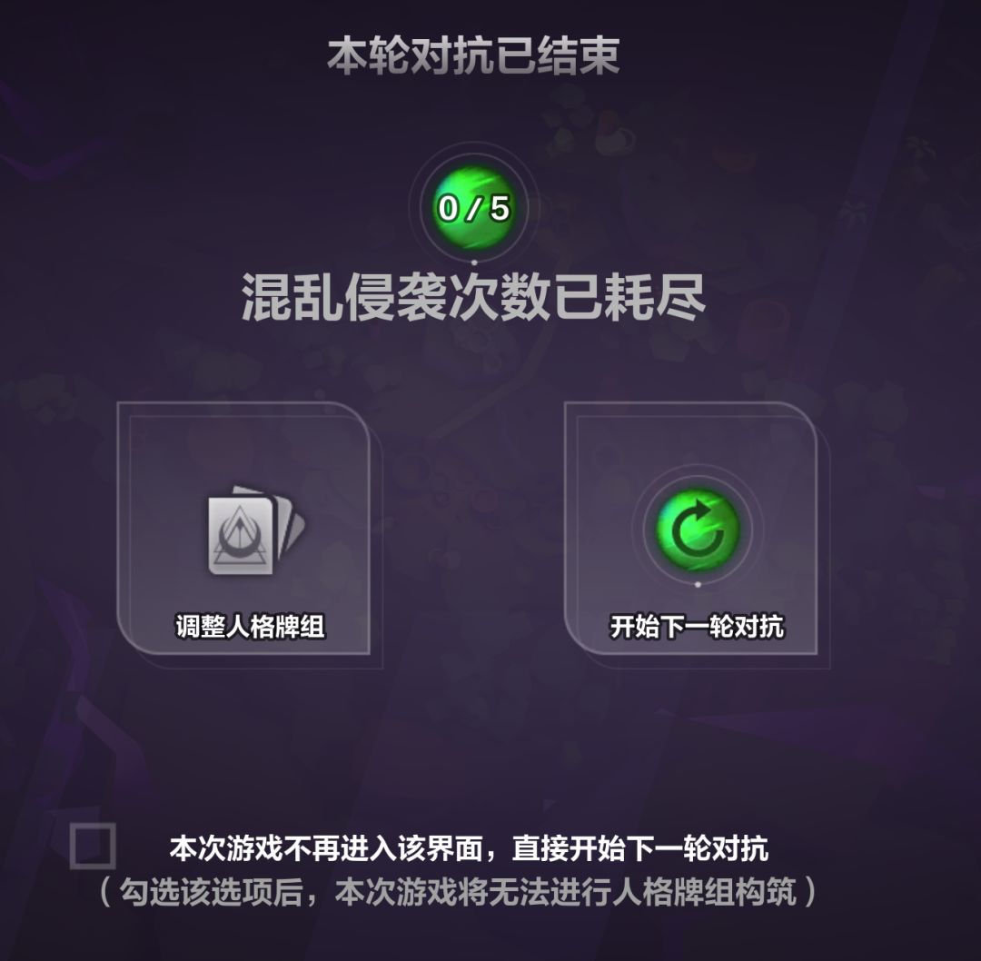 当每一轮的混乱侵袭次数消耗完后,位面就会自动进入新的一轮混乱侵袭(每轮侵袭次数:5次 可通过 人格-正直 混乱-怯懦卡牌降低消耗侵袭次数)。