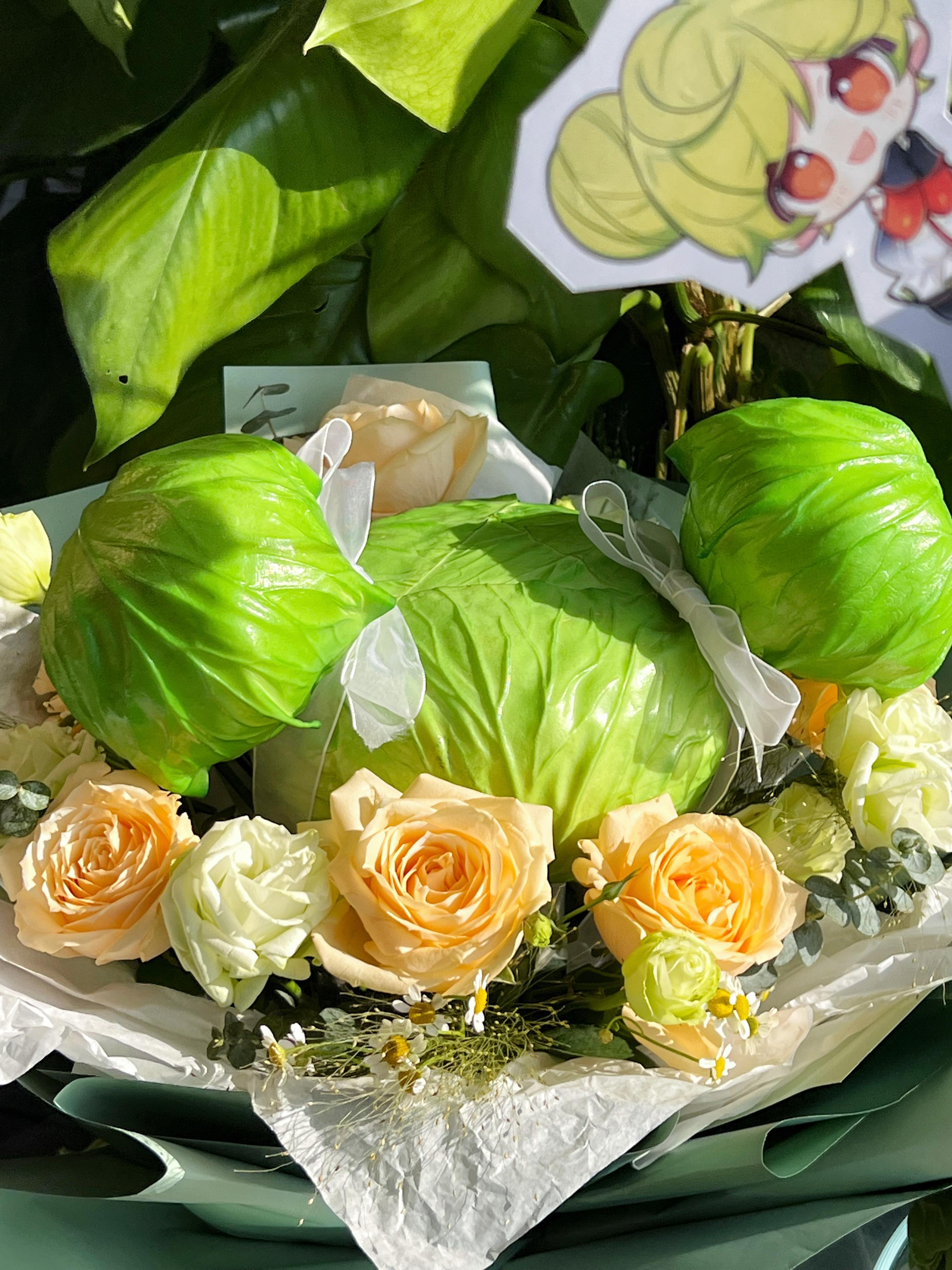 快看!由绿油油的蛋糕、鲜花和包菜(?!)构成的派对!既然是一年一度、值得纪念的生日,那今天就和爱酱一起留下愉快的回忆吧~