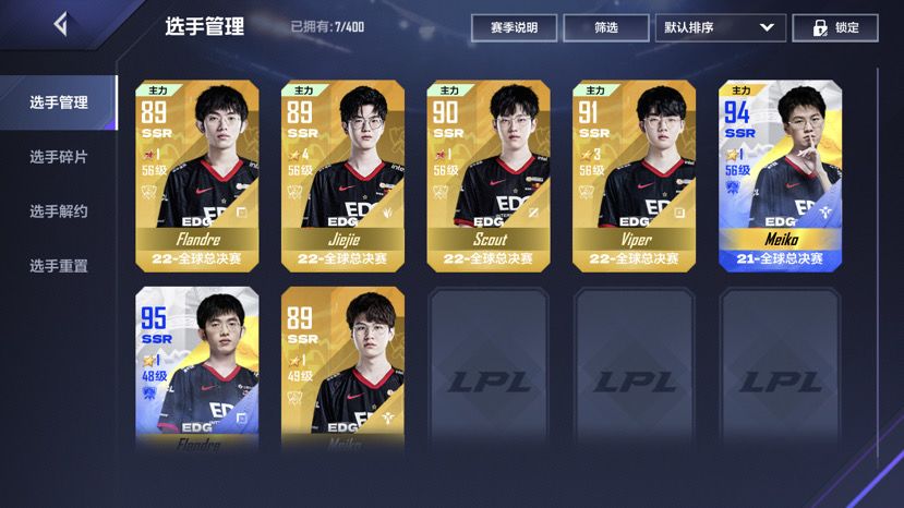 计划是养金卡,慢慢屯EDG冠军卡和巅峰卡。 直接无缝衔接,正好edg普卡,巅峰卡(后面会出),冠军卡都有,成长空间足够,还不担心置换之后的阵容搭配问题