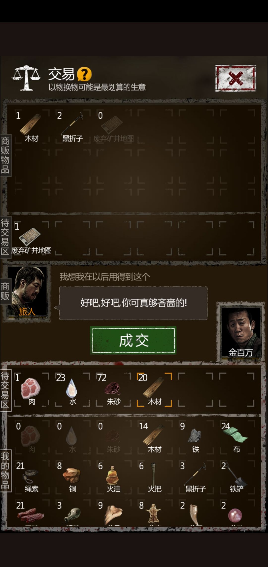 先拿一堆廉价东西(能用两个折子白嫖的东西)换地图:水,肉,木板,朱砂。