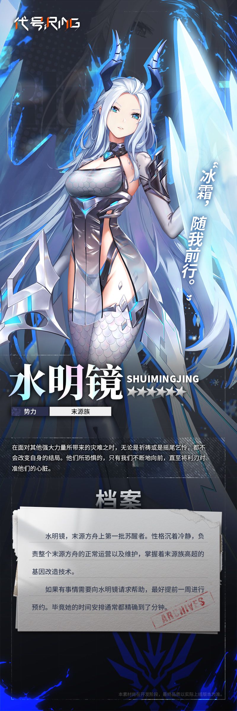 档案:水明镜,末源方舟上第一批苏醒者。性格沉着冷静,负责整个末源方舟的正常运营以及维护,掌握着末源族高超的基因改造技术。如果有事情需要向水明镜请求帮助,最好提前一周进行预约。毕竟她的时间安排通常都精确到了分钟。