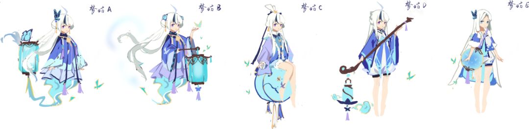 最开始构思主题的时候,我们想要塑造一个突出梦境与虚幻结合的少女,同时要与长安国风主题结合,在翻阅许多资料后决定选用“庄周梦蝶”作为梦姑的主设计元素。