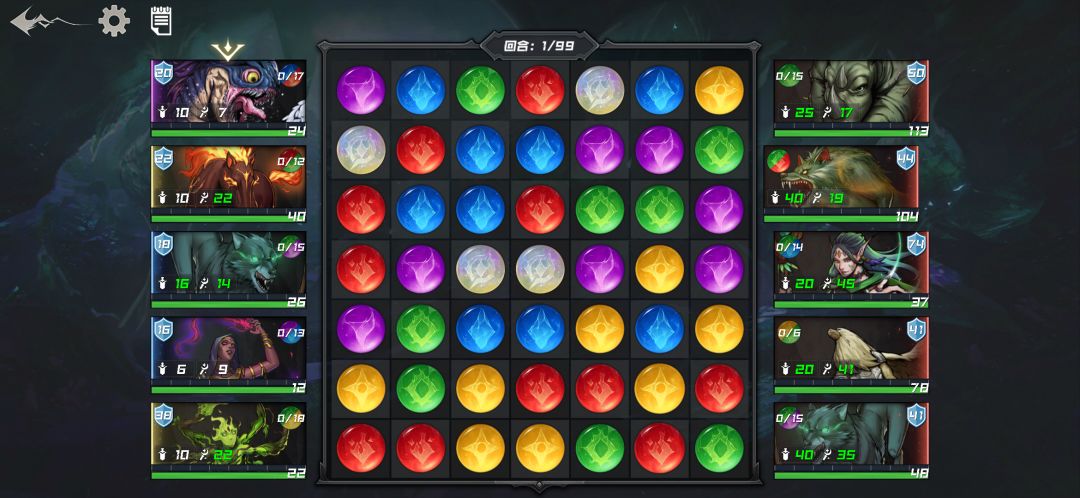 如图所示,这是一场战斗。左侧是我方随从,右侧是敌方随从,中间棋盘遍布7x7=49个心能。心能总共有红黄蓝绿紫白,6种颜色。