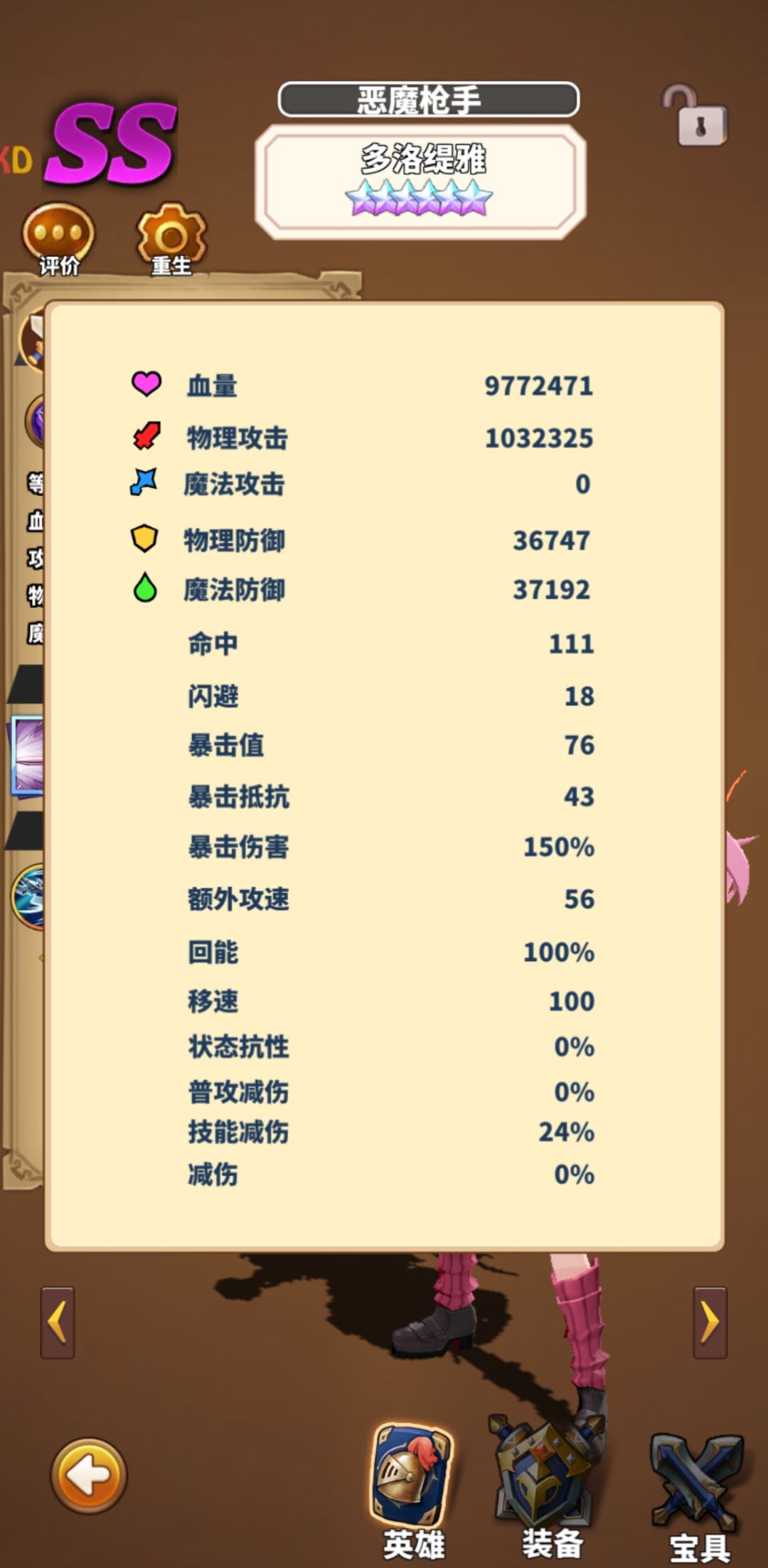 更新后拆了一个11,凑了一套14,其余辅助10,9,9,9。宝具多数是一星两星,全给飓风了。整个十层没有变过阵,光锤光奶暗魔面包辅助暗枪,注意没有卡点,铁匠、绿萝、埃及、双枪都不是问题,甚至天神下凡都没有感觉,泡泡暗枪神器洗命中,平时双攻,暗魔面包闪避,光锤光奶速度。宠物小鸡,双减伤攻速和控制时间具体如下: