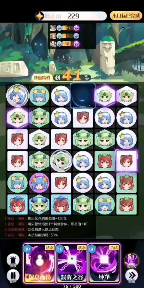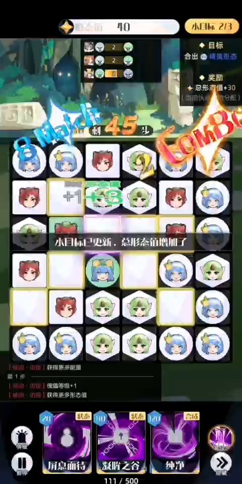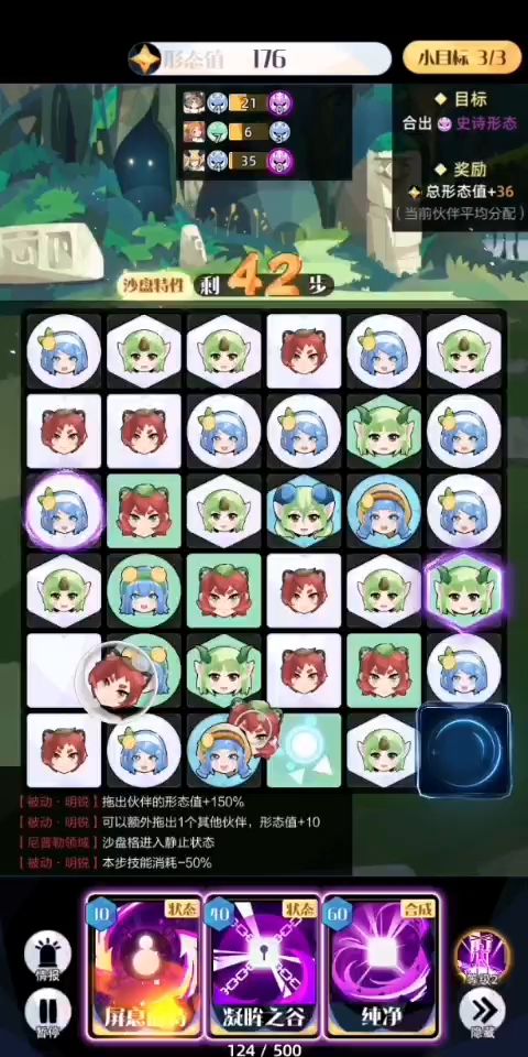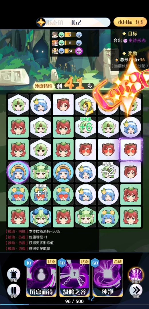 3.新手或者摆盘困难的建议在摆盘前优先“屏息”合成较多的同形态伙伴,特别是白色,千万别留六个以上,不然摆盘挺难受的,在开局时尤为明显。
