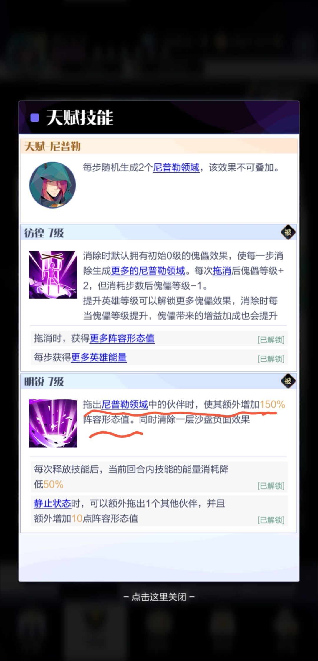 摆盘尼的基本原理,如图可知,尼普勒的被动技能“明锐”,拖出领域内伙伴,可增加150%(80级以上尼即可)阵容形态,也就是1个能抵2.5个,并且在释放技能之后,下次使用技能消耗能量减半(同一步内),此二特性是“摆盘尼”之根基。