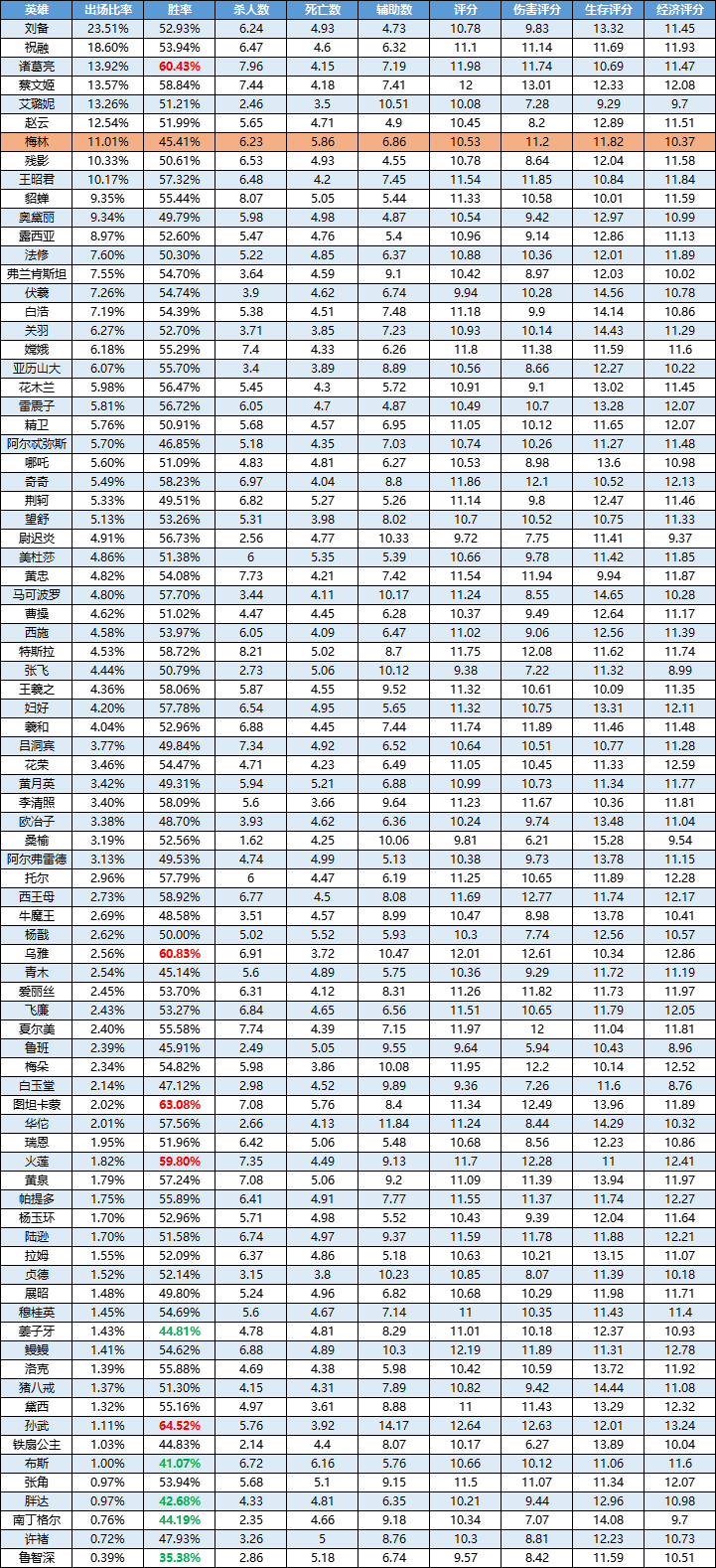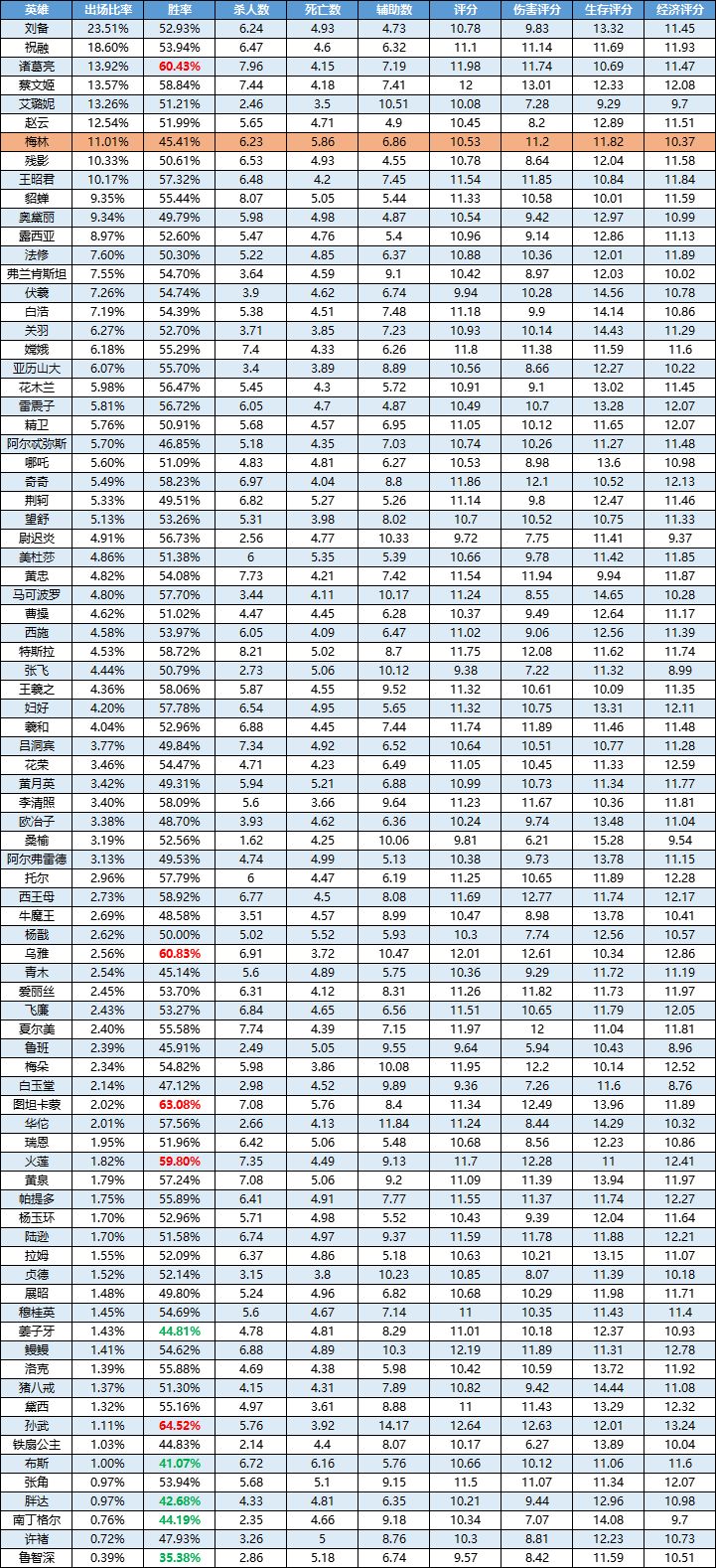 注:此榜单按出场率由高到低排序,标红为胜率前5的英雄,标绿为胜率排名倒数的英雄