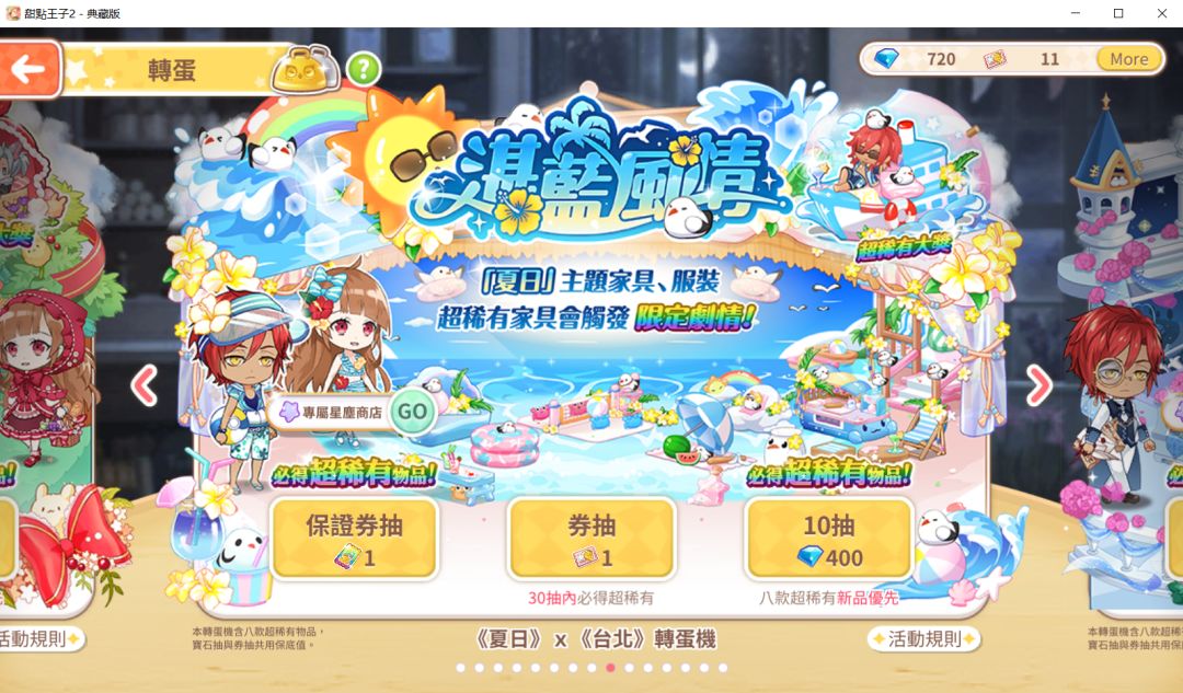 3 家具和服饰池和手游的活动池一样,但是不同的是,如果用钻石抽,400钻10抽必出超稀有。而用转蛋券抽的话,则是保底30抽,每个卡池单独计算。说真的,基本都是保底出的,而且重复率依然和手游一样坑爹。