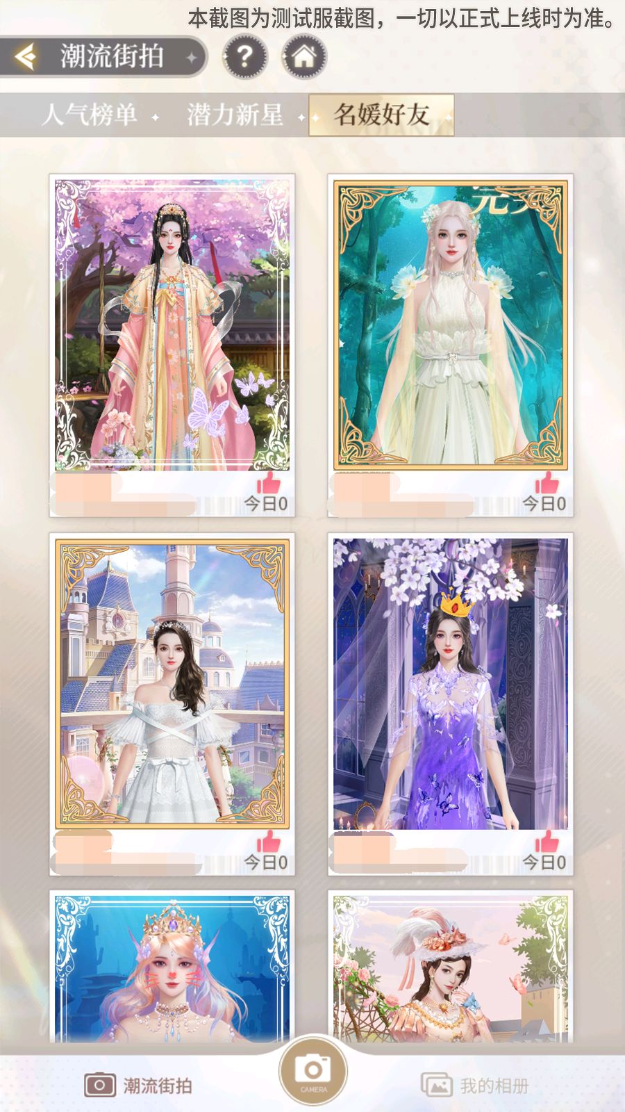 潮流街拍:展示分为人气榜单、潜力新星、名媛好友三个分类进行展示。人气榜单显示今日点赞数最高的照片,潜力新星每次随机展示其他三小姐的照片,名媛好友显示名媛会和好友的照片。看到喜欢的照片,记得点赞收藏哦~