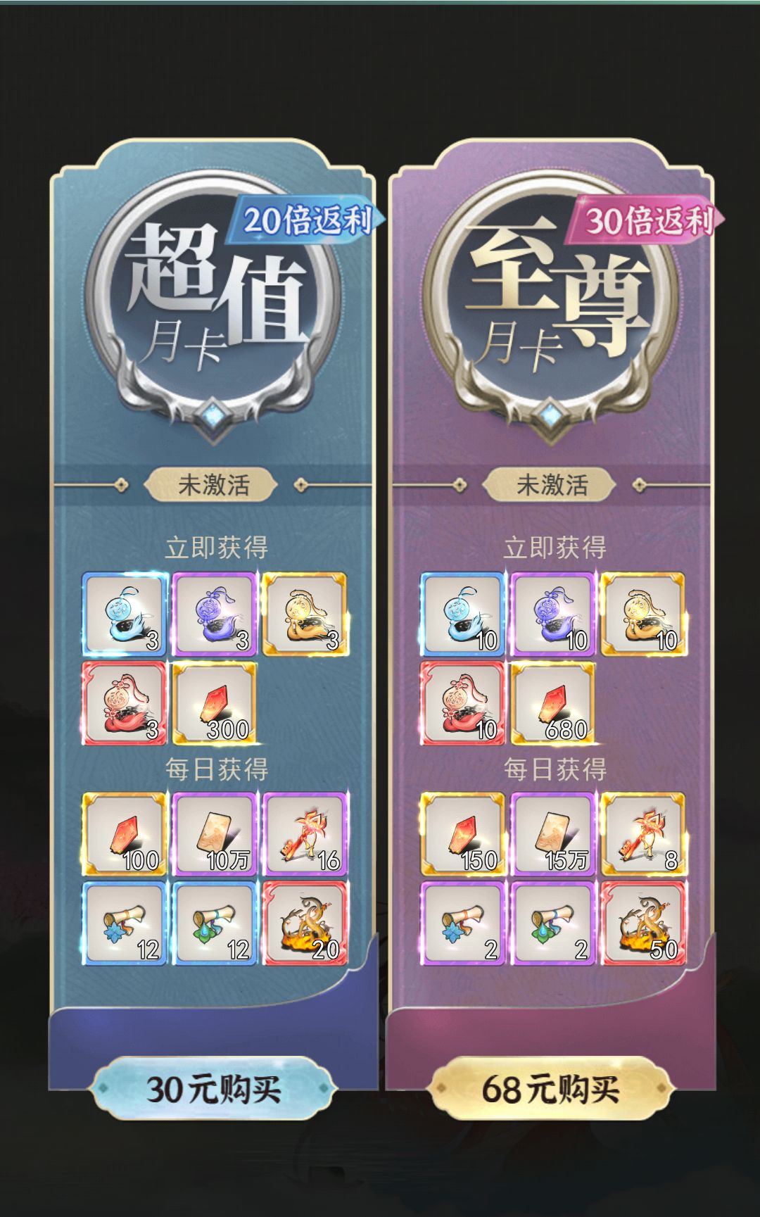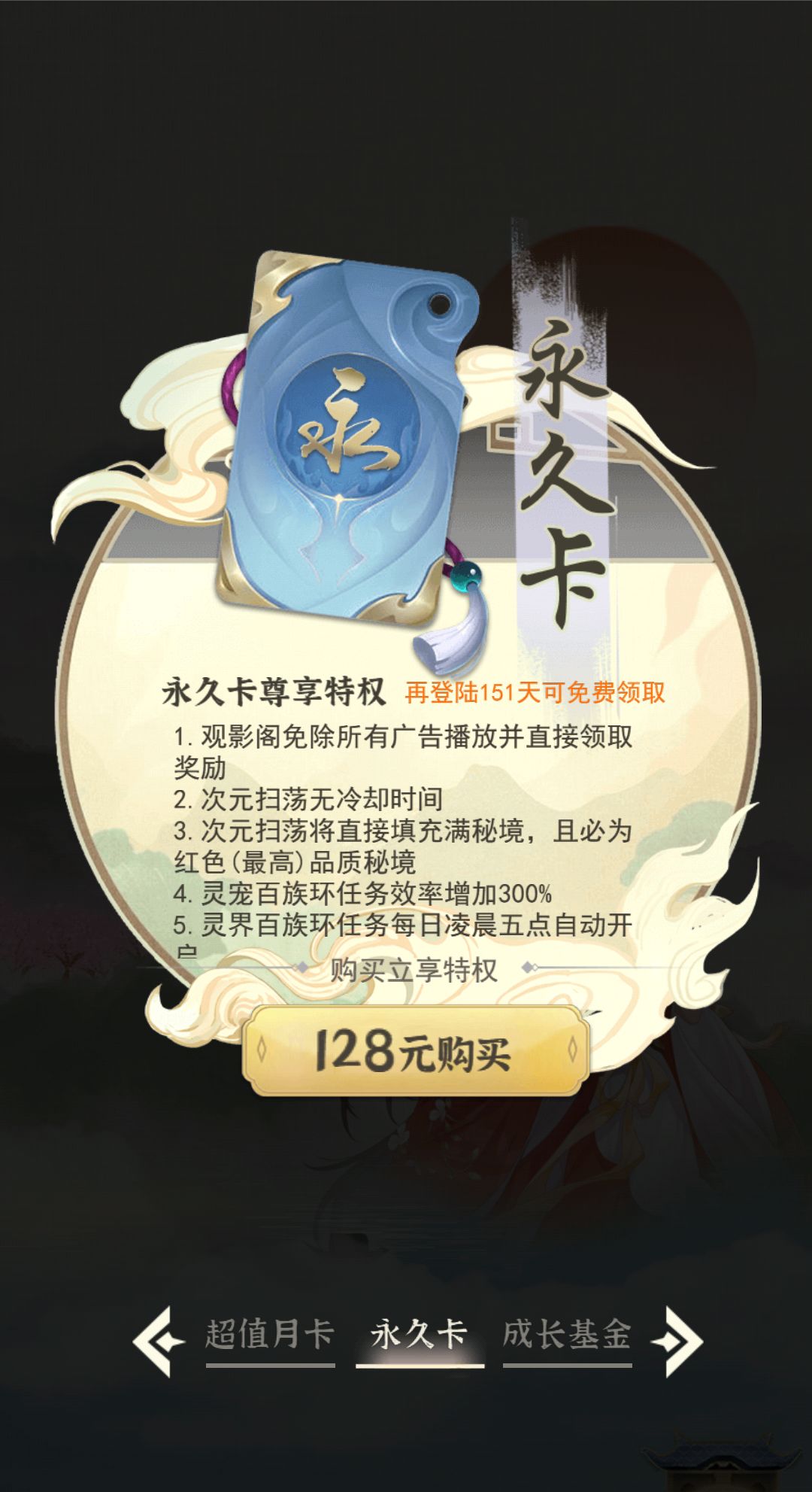 注意看, 双月卡主要给的是仙玉和加速钥匙以及万能碎片,仙玉你按我之前的两篇攻略,不瞎花指定不缺,加速钥匙遗迹和宗门商店都会白给。永久卡主要是免广告,你按我之前的两篇攻略,基本不缺什么材料,缺什么材料,每天看几个广告支持一下也是可以的,另外,登录满180天,免费开通永久卡