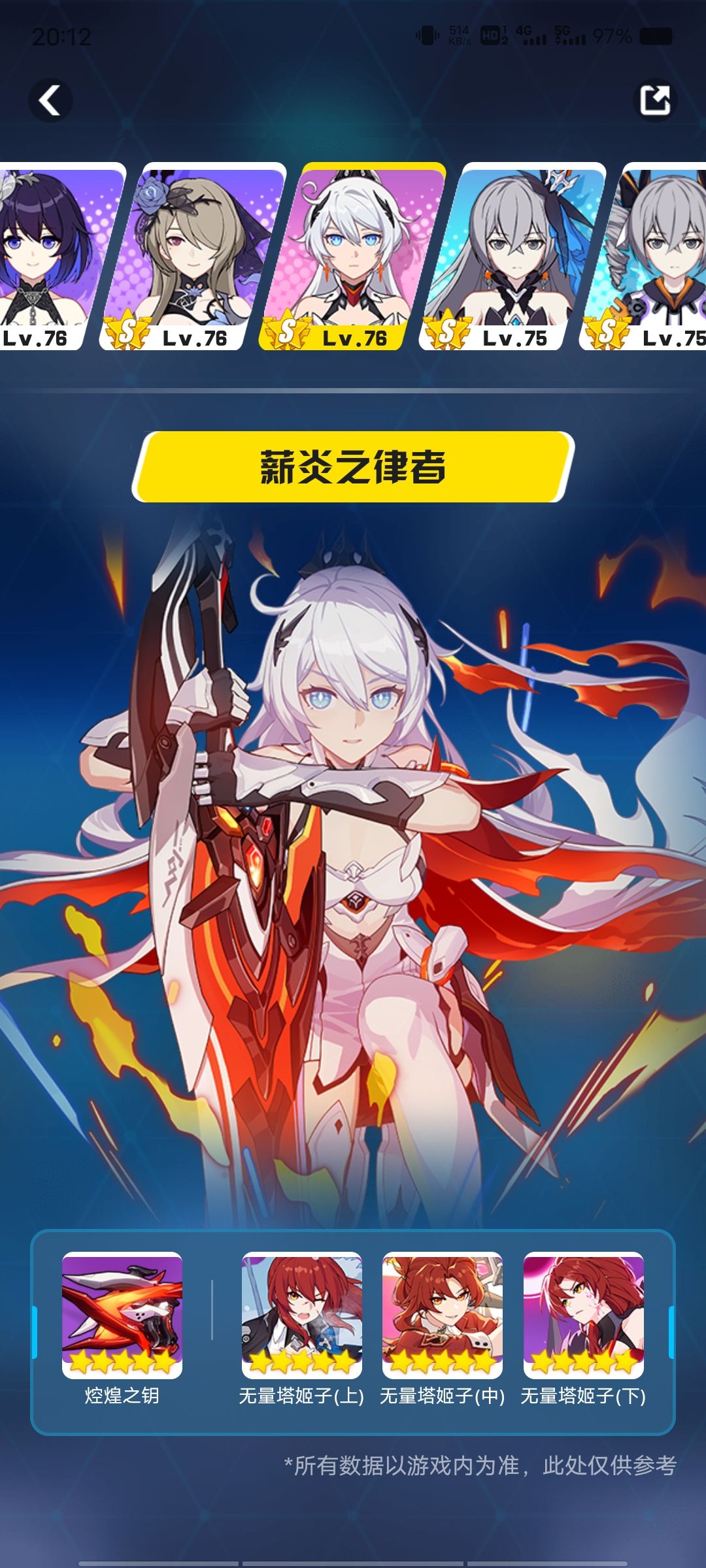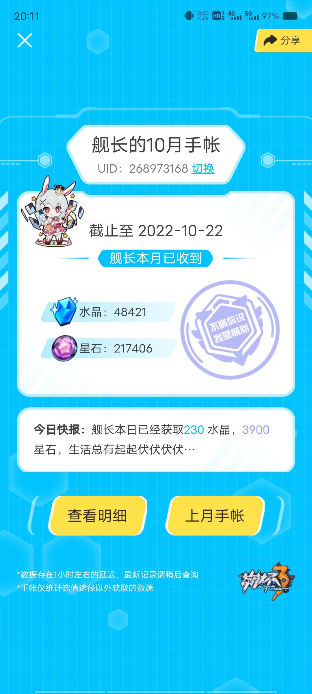 入坑了两星期,氪了五百,买了新手礼包30,60,98,手册和月卡,全砸在了新手池(我比较犟),一定要把炎律毕业,昨天晚上毕业了炎律,(比较非),总共主线也肝完了(系统显示平均玩一天七个小时),才发现最后一个圣痕真不应该给我出,出来就不想玩了,今天下午把它删了,攒钻石不想攒,没动力,也可能因为主线做完了钻石不好弄了,崩坏再见,转战隔壁原神了