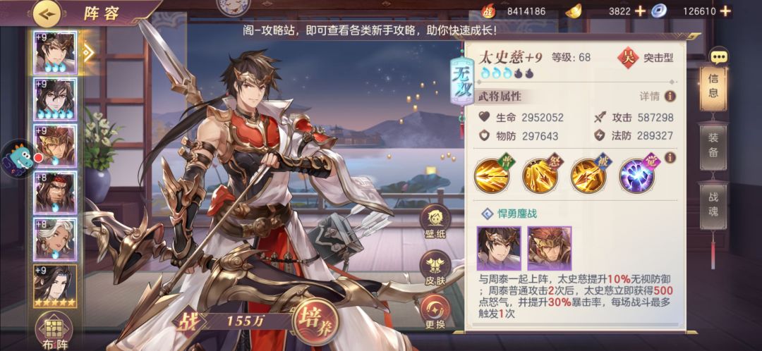 战魂搭配 :太史慈有2种战魂选择 爆裂和弱点 弱点更趋向于稳定 爆裂更趋向于爆发 2者搭配方式各有优劣 需要小将军们自己斟酌了