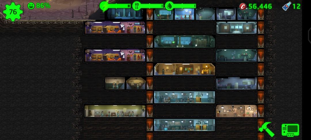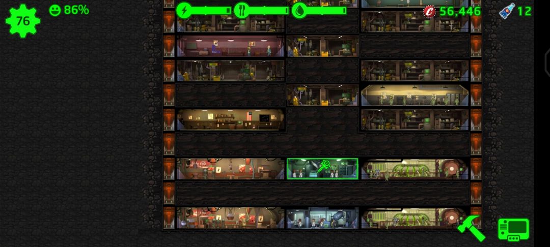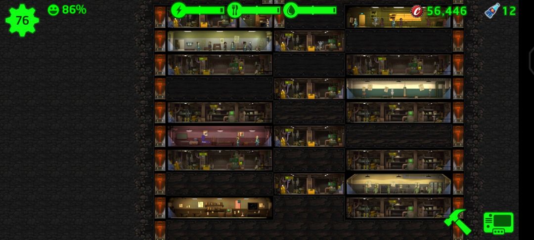 前期人员平均素质不高的时候,把人一股脑往电房水房食物房堆,打开右下角小册子,如果点状态那一栏,最好能保证食物,水产出高于每分钟消耗10左右(最好是两倍),就可以把多余的劳动力丢去训练房,前期不怎么进行废土探索只要保证药有10个、消辐宁5个来应对灾害就行。