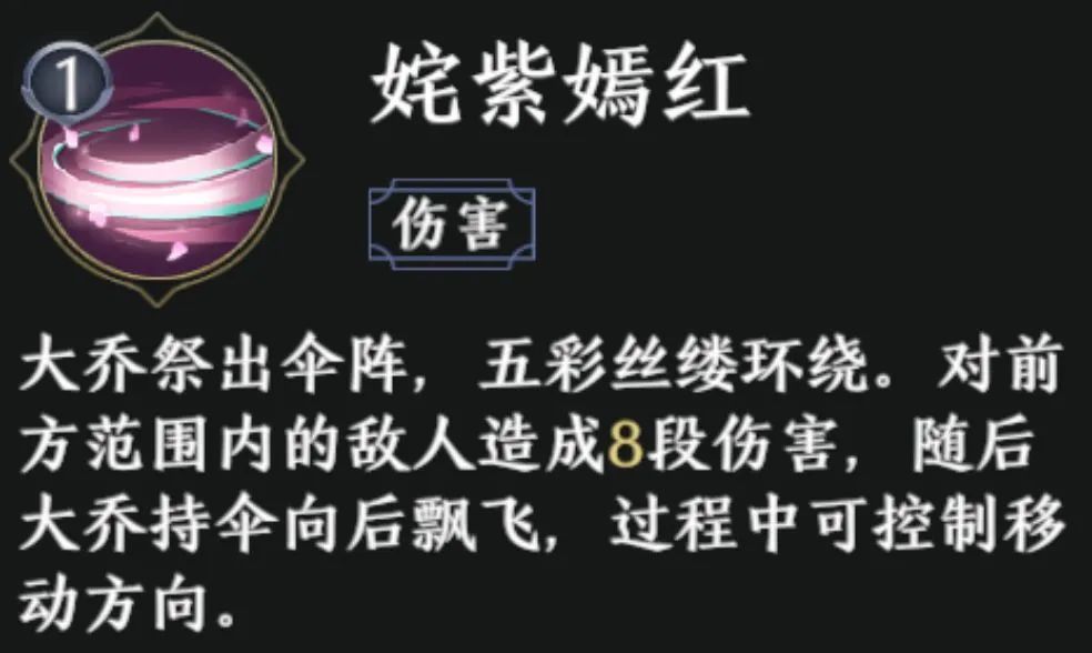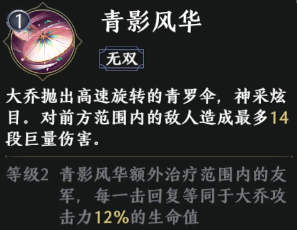 大乔的无双技【青影风华】可在前方释放范围极大的伞阵,造成14段的巨量伤害;若该技能达到2级,则在造成高额伤害的同时,每一段攻击还可回复等同于大乔攻击力12%的生命值。