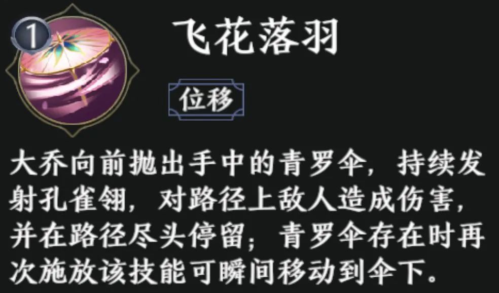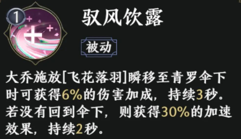 大乔作为远程武将,其生命值相较近战武将来说较弱。但其位移技能【飞花落雨】搭配被动技能【驭风饮露】,在使用飞花落雨2段时,可以瞬间移动到伞下的方式躲避技能,并获得30%的加速效果,可持续2秒。两个技能搭配得当,可快速与敌人拉开距离,减少收到的伤害,提升自身生存能力。