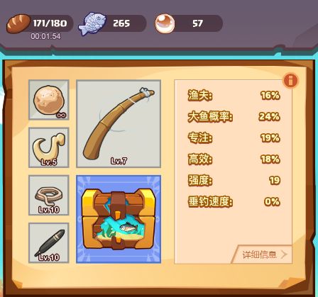 钓竿:1阶10级的鱼竿增加28.5%的大鱼概率和19%的渔夫加成。