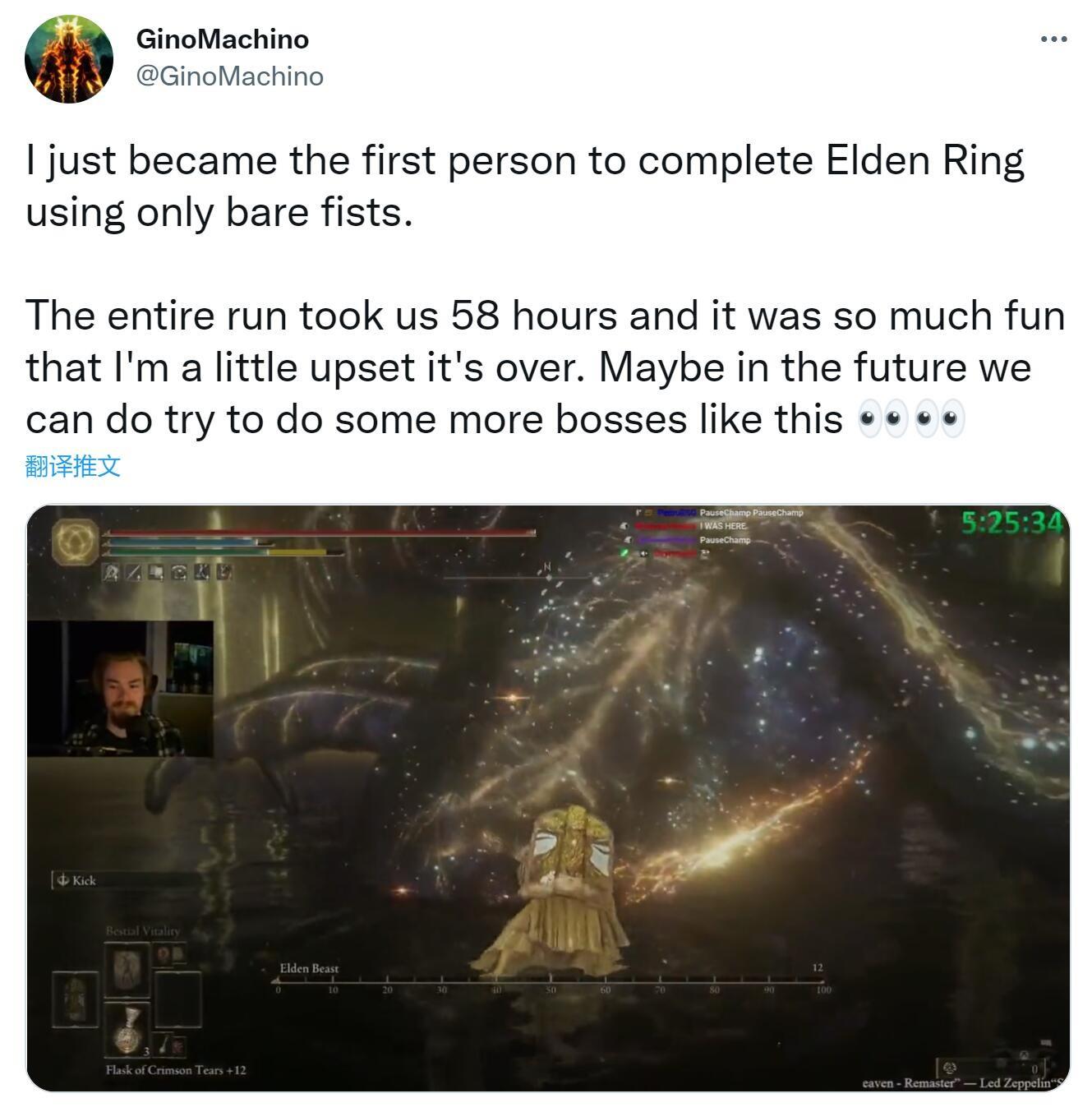 玩家“GinoMachino”上传了一段《艾尔登法环》中赤手空拳通关艾尔登之兽的视频,并表示整个游戏流程都是自己靠双拳打出来的。