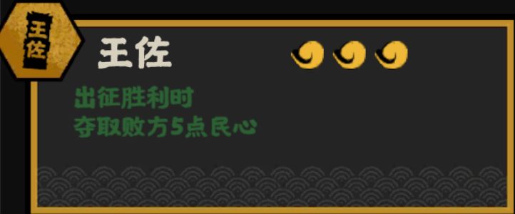 姜尚二技能王佐:出征胜利时夺取败方五点民心,姜尚的核心技能决定了姜尚提供民心的功能性。大家可能会说孔子老子也可以啊,加的战力又多不比姜尚好吗?其实姜尚提供民心的量远大于孔子与老子之总和,在中期开始发力时,有此技能姜尚夺取的民心完全可以用于加速政策,破城后夺取钱粮,不用顾忌民心。这里有一个小技巧,假如触发了民心过低(城市民心过低触发)的事件,可以先不处理事件,等出征军队夺取民心至40左右,再进行处理,除此之外,初始四名臣如果带了姜尚处理事件时不断选择降低民心来节省资源。