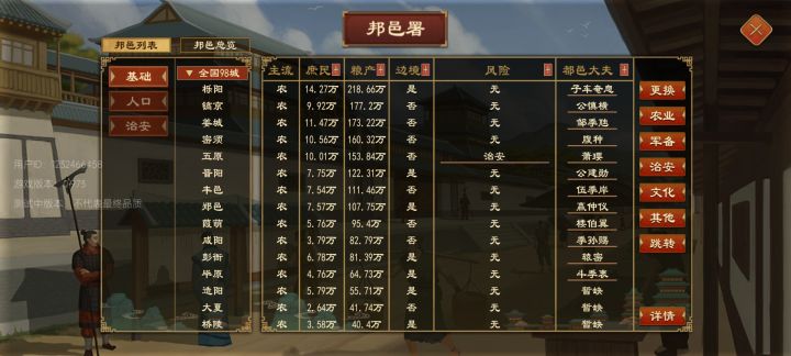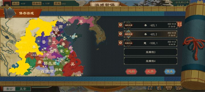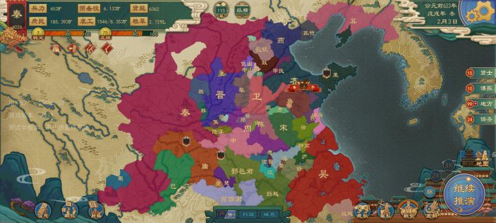还是玩大国好点,我不适合玩小国,玩小国太折磨人,玩游戏就图个爽,一座城池的产量已经抵一个小国十几倍的一年产量了,灭掉巴蜀庸,占据巫山、西域一带,上面再干掉燕萁一带,中部推掉晋,右下平原路线太多,最后推,不然那些敌国军队跑来跑去,光靠军队两两出击堵不住,唉,被复国主义搞怕了,不想频繁的在那点换地,换地还不一样成功,兼并慢慢推