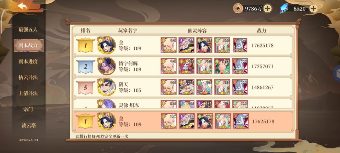 这个阵容是副本(之后要两支队,蝎子换成9星土猴才是我的主力,实际战力第三周末尾才900W不到,神器和灵运拉上来的),今天好像是第四周第一天,仙灵已经全通了