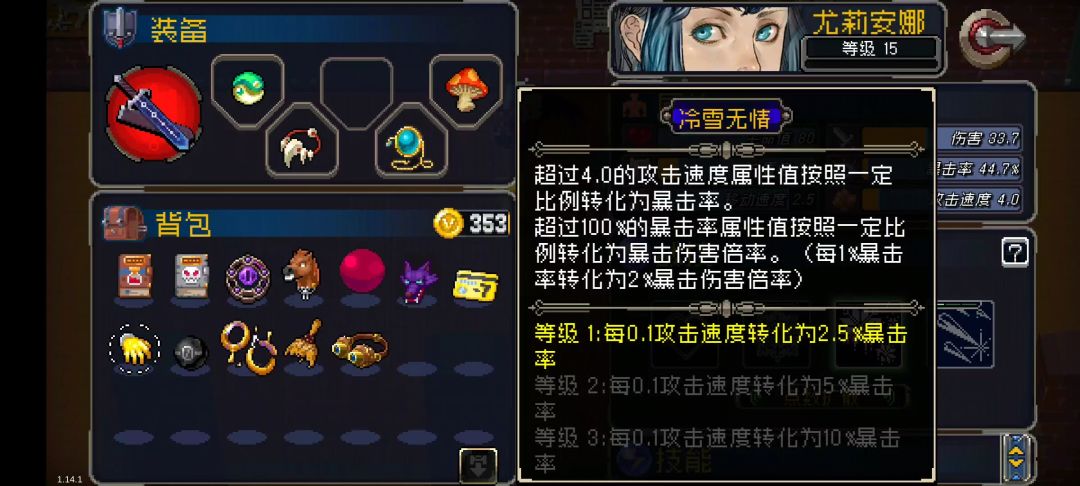 。这个帖子是要聊聊女剑的冷雪无情,技能效果分成两部分,一是攻速上限变成4.0,溢出部分比例转化成暴击率,二是溢出暴击率比例转化成暴击伤害。因为这个技能触发需要4.0的攻速门槛,导致其在大部分时候都是一个鸡肋一样的技能,按照技能效果,如果女剑在不装备额外暴击装的情况下想拥有80%额外暴击率(即百分百暴击)和80%额外暴击伤害,需要将攻速堆到5.2并且拥有3级的冷雪无情,但是这些属性其实只需要一个虎牙项链和一个暴击透镜就能做到,在常规模式道具栏有限的情况下,实在是付出和回报不成正比。然而我刚才做了个测试发现实际情况并不是完全如此,这就要请出我们的虎牙项链来协助了。