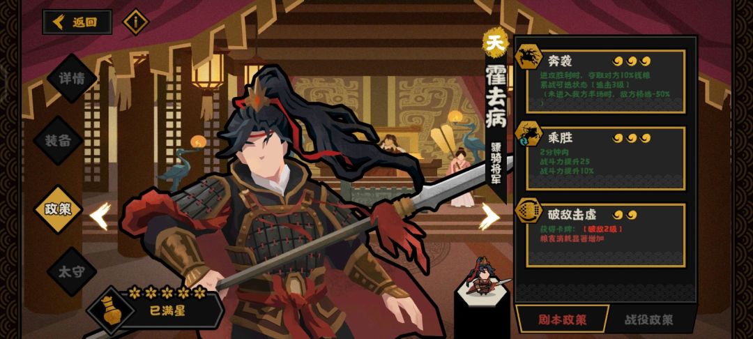 怎么说呢,一技能奔袭和妇好二技能一样抢夺流的,虽然抢的没妇好多,而且需要1马启动,追击在累战中出现的概率感人以外,其实还能用。二技能乘胜需要1铁有些感人,前两个时代是青铜,后面的时代需要铁,除了大汉铁充足外,春秋战国和秦楚汉缺铁太严重,有些政策需要大量的铁,如果给霍去病二技能用,只有两分钟,百分比的战力需要后期加的才多,前期太奢侈,三技能15%需要配合娥皇女英提高容错率