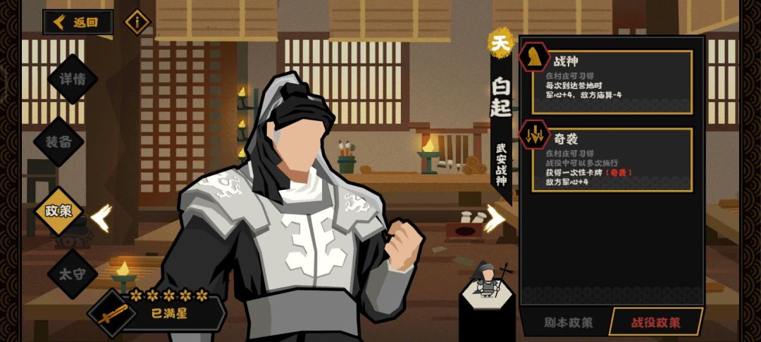 一技能奔袭:出征胜利时,夺取敌方10%的钱粮,累战可以选择状态【追击3级】:敌方未进入我方半场时,格挡-50%,需要1马