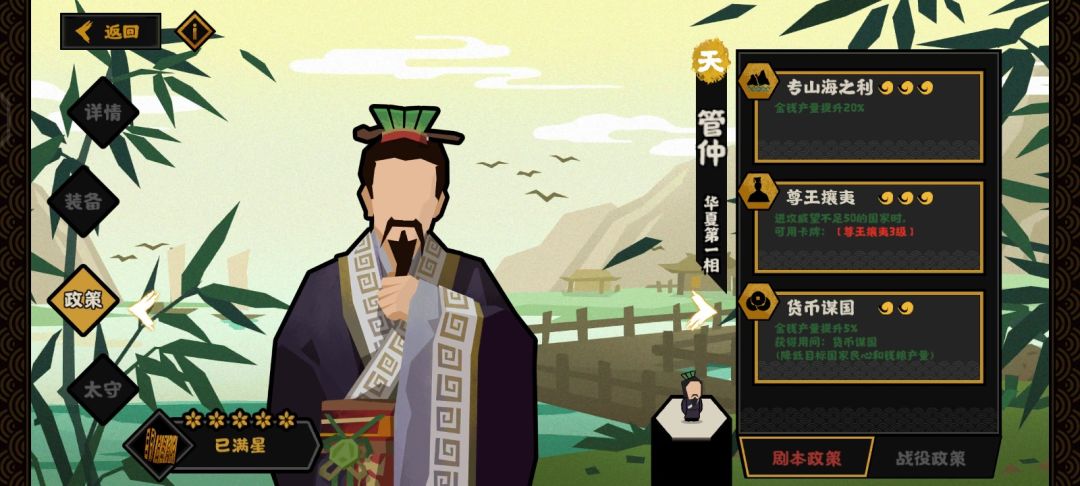 管仲主要是强大在他的二技能:尊王攘夷,进攻威望不足50的国家,可以使用卡牌【尊王攘夷】:友军的士气,格挡,攻击提升(卡牌范围也很大,几乎全图范围,效果还很大),至于如果让敌方威望低于50,一种是会盟选择降低对方威望的条约,第二种是带孙武/白起抢夺对方的威望