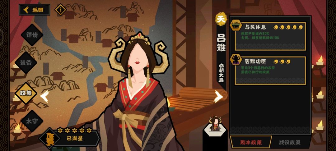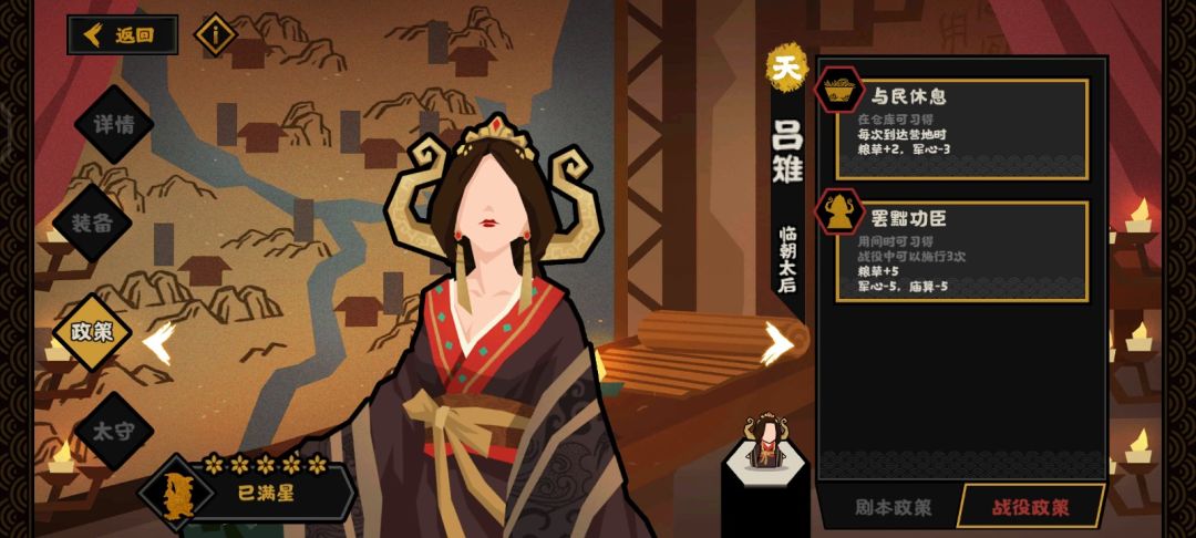 一技能帝王术:每消灭一个国家,战斗力+12,腐化-4