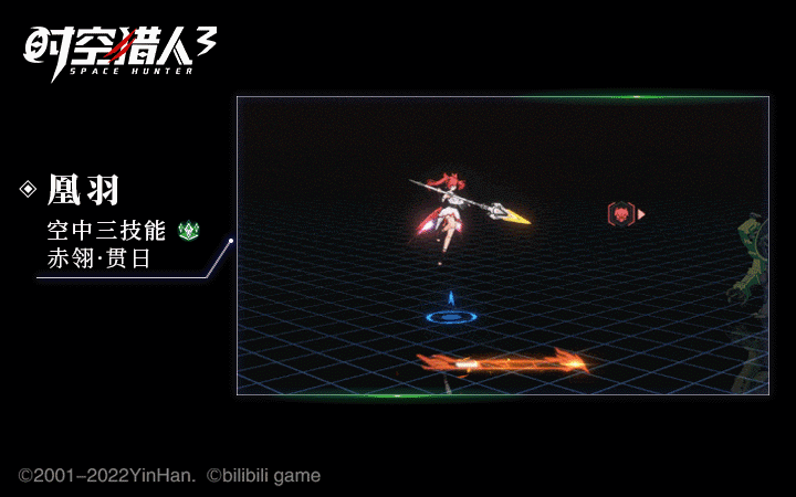 「凰羽」使用追击技能<赤翎·翔雷>可以进入空中状态,空中状态不仅机动性大幅度提高,技能压制效果也大幅提升,是极强的战场压制型输出手。