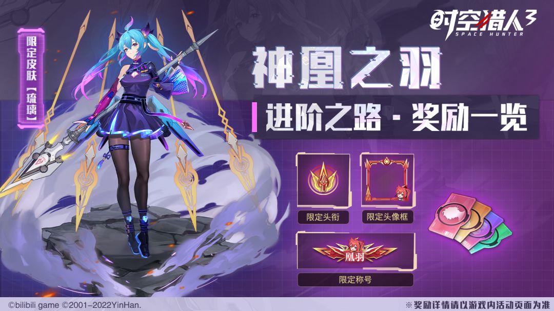 ◆活动期间提升史诗猎人「凰羽」,可通过【神凰之羽·进阶之路】领取限定头衔、限定头像框、限定称号、限定皮肤、限定招募券、芯片补给券、武器补给券、猎能补给券的品质达标奖励,并解锁相应档位的特惠礼包~