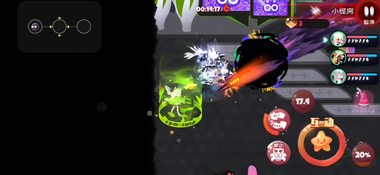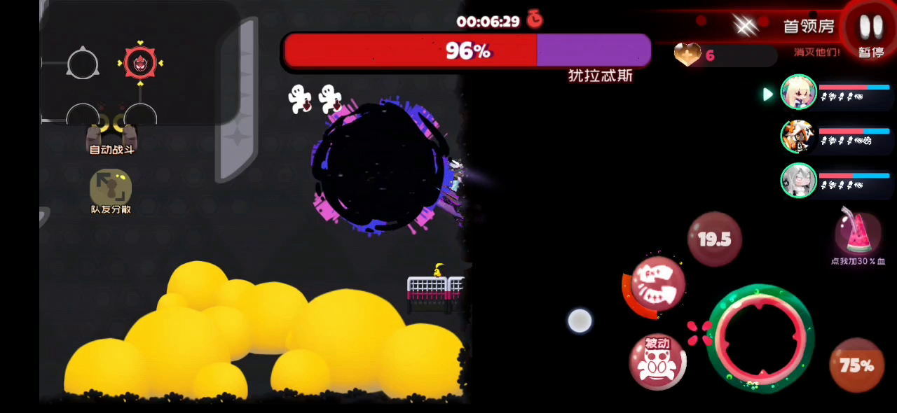 另附:游戏特性(?)——按住人物输出,然后进入传送门前,出现互动按钮后,移开,再进入传送门,点击互动,进入下一关人物会自动攻击