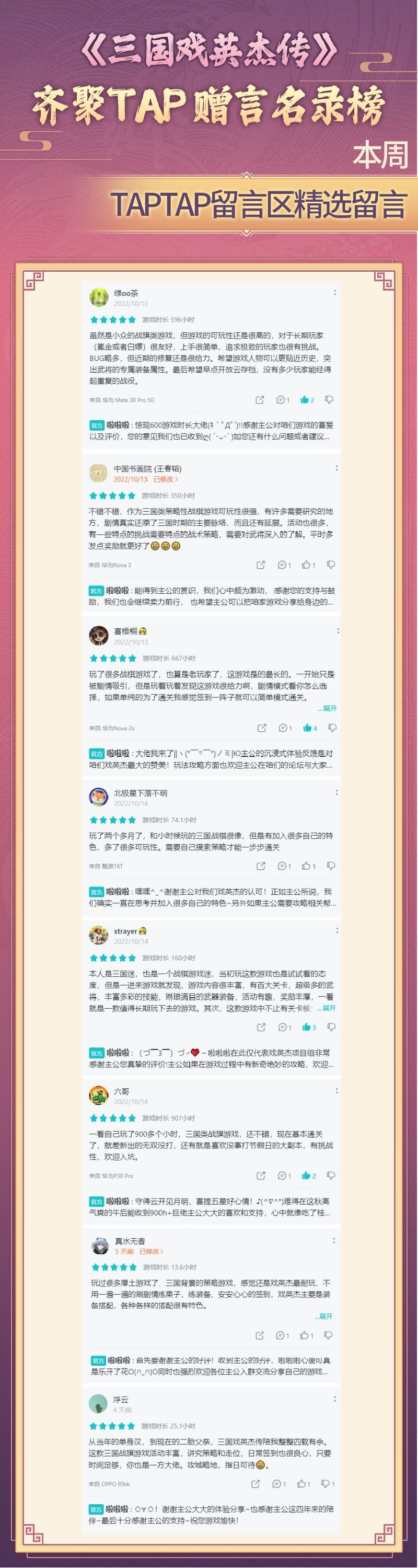 在这里,每周都有许多主公们在TapTap的留言区给“戏英杰”游戏送出许多肯定、赞许、鼓励的话语。在此我们特别感谢能够在TapTap这个重要的游戏平台上给予“戏英杰”最大支持的各位主公们!