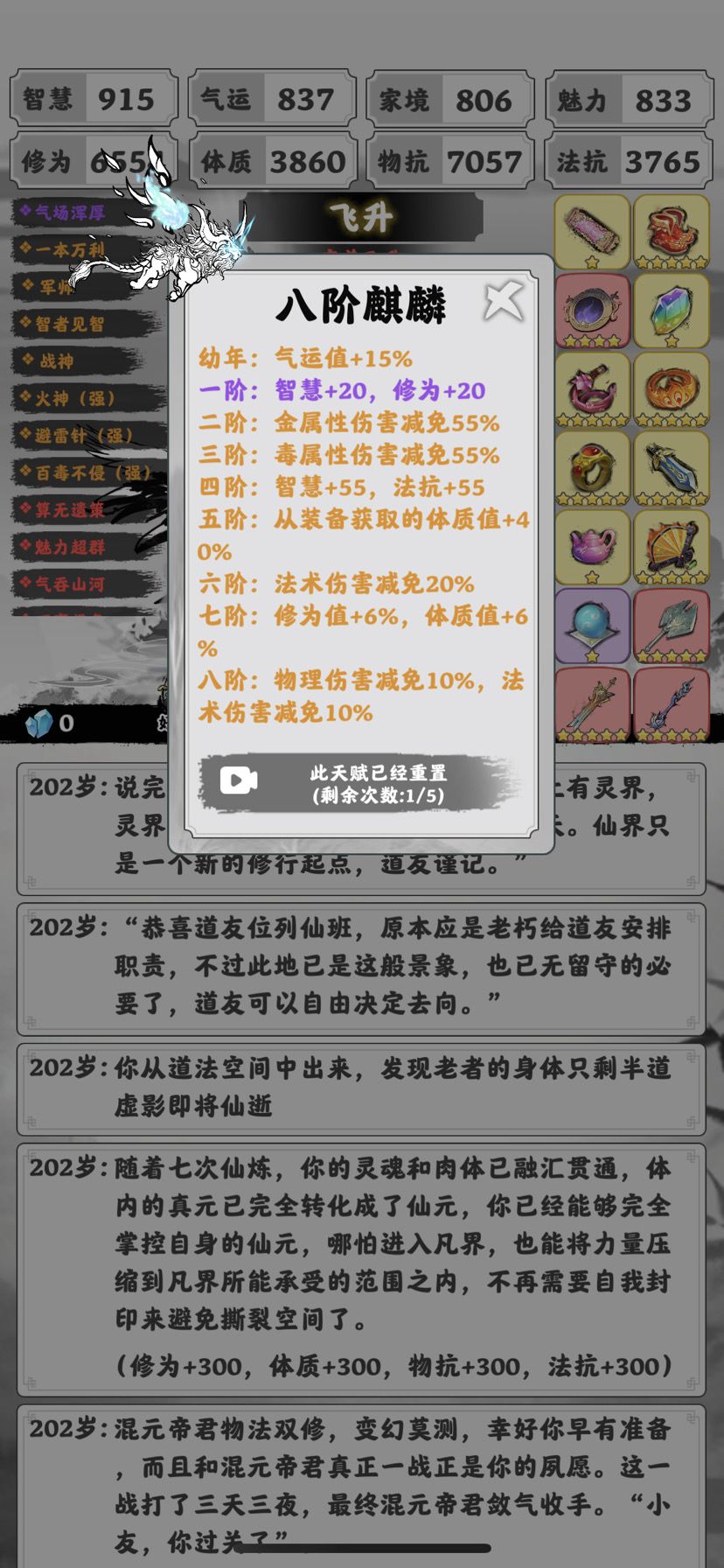 听说上四维事件变多了,果断选择丹墨,然后两把丹墨拿完新版本极难称号,丹药和装备极其宽裕……注意一下修为,除此之外毫无压力飞升仙界拿了往来,然后完美飞升(带错了)拿了天才修士……