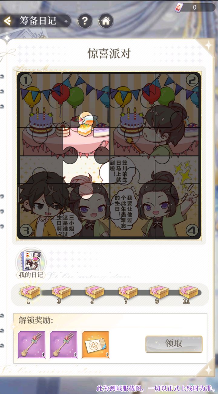 筹备日记中包含多张手绘漫画,每张漫画由12块锁定区域组成。活动期间每天会开放一定数量的每日任务,三小姐通过完成每日任务可以获得解锁漫画所需的【手绘拼图】。每张漫画锁定区域完成一定数量解锁时,可获得解锁阶段奖励。当筹备日记上所有的锁定区域全部解锁后,可以获得一份解锁大奖,同时将开启新一张漫画。
