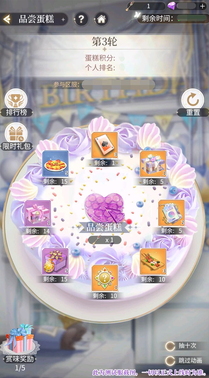 4、活动期间每天开启1轮品尝蛋糕,每日22点后根据该轮品尝蛋糕活动的个人积分进行排名结算,届时可领取当日排行榜奖励。
