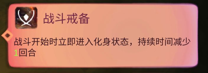 战斗戒备:战斗开始时立即进入化身状态,持续时间减少1回合